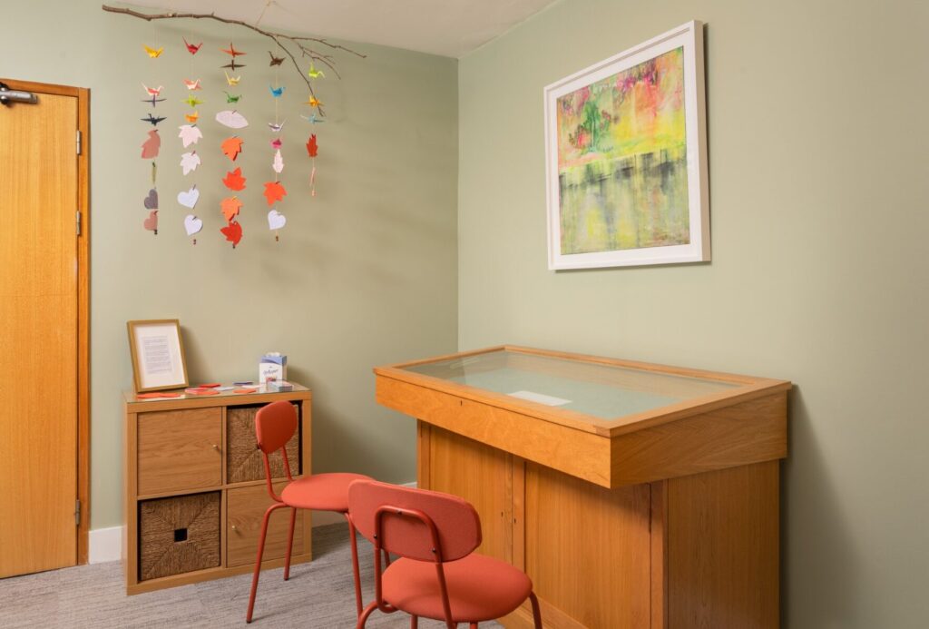 Next to the chapel is our Reflective Space – a calm and welcoming area for patients, families and visitors. This space is for anyone who would like somewhere peaceful to sit, think, remember or just pause.
